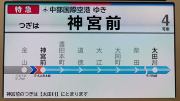 豊橋・中部国際空港方の2両、特別車は2ドアで各車両後ろ側のドア周りに大きく号車番号がプリントされているのが目立つ。