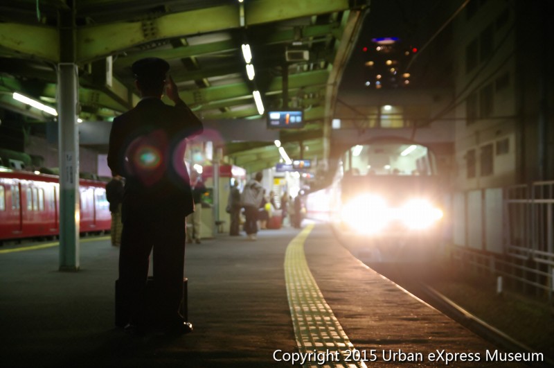 神宮前駅での乗務員交代シーン。夜だったのでどう撮るか迷いましたが、やってくる列車を敢えて背景にして撮影したらどうか?と思って撮影した一枚です。