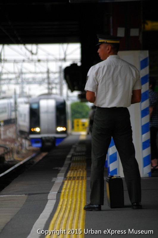 神宮前で乗務員交代を待つ運転士と到着するミュースカイ。撮影していたらたまたまこんな感じのきれいな構図になってくれました。