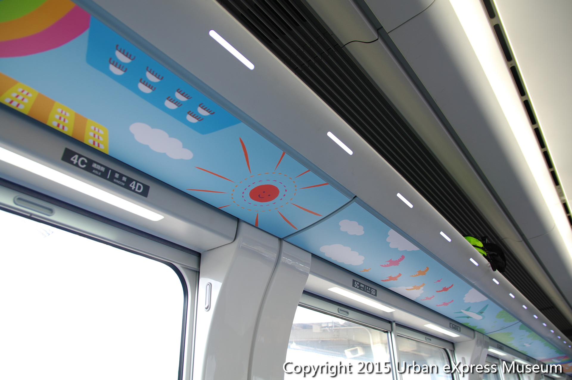 セントレア開港10周年記念ラッピング列車の車内は、荷物棚にも鮮やかな空のラッピングが施されています。