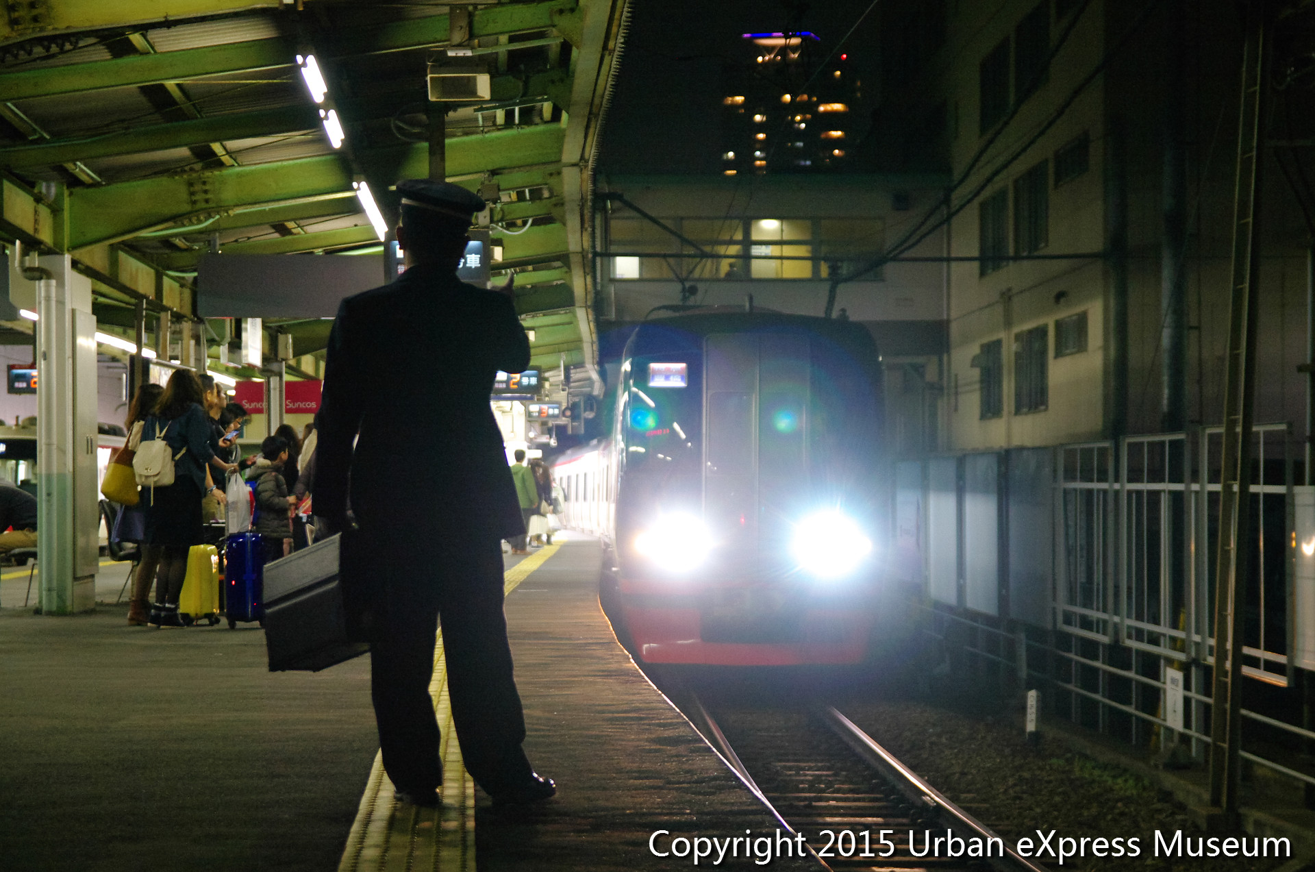 確認作業を行う運転士、大きな荷物を持って到着を待つ乗客、そして真っ白いヘッドライトを輝かせて滑りこむ特急列車・・・。夜間でしたがいいシーンでした。