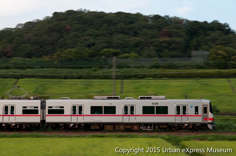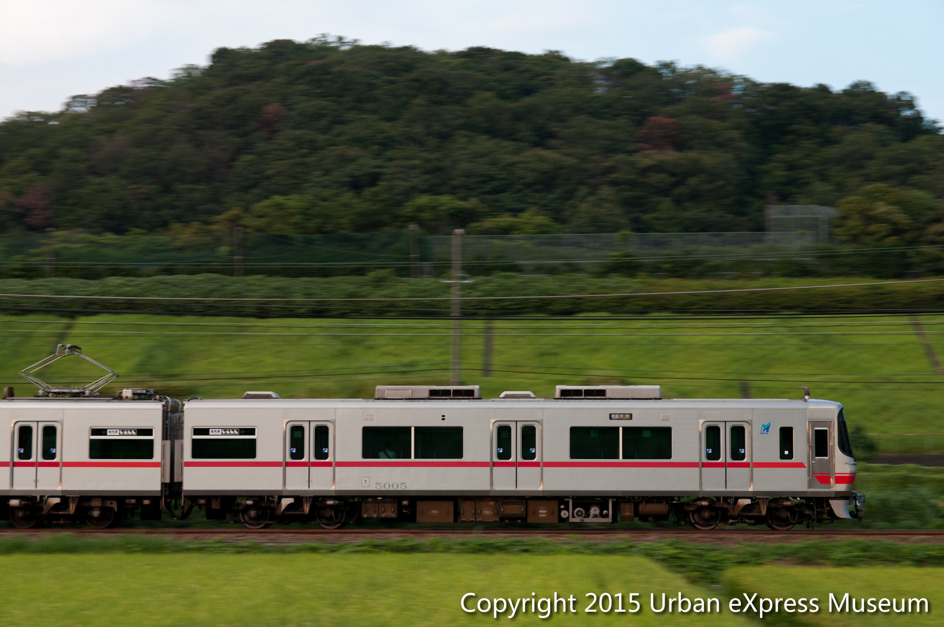 真横から5000系を流し撮りしてみました。窓やドア部分の1本線があるのは3300系と同じですが、乗務員扉から先頭に向けてパノラマスーパーを彷彿とさせる2本の赤いラインが加わっているのが特徴です。